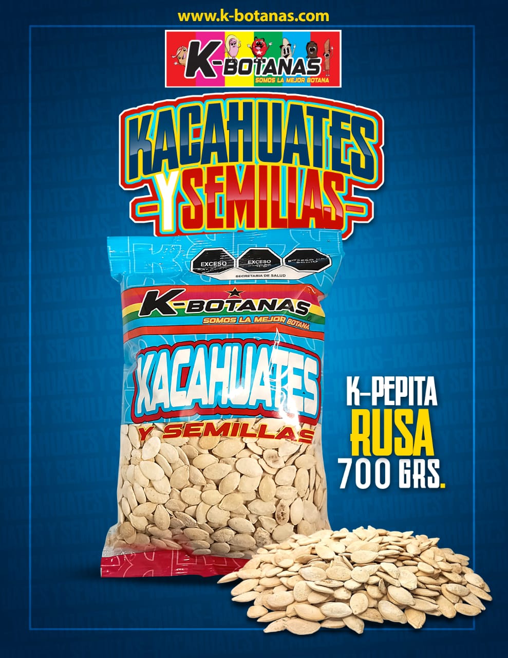 Deliciosas pepitas rusas de K-Botanas con un crujido irresistible y un sabor único. ¡Compra ahora y experimenta la mejor botana de pepitas rusas en línea!