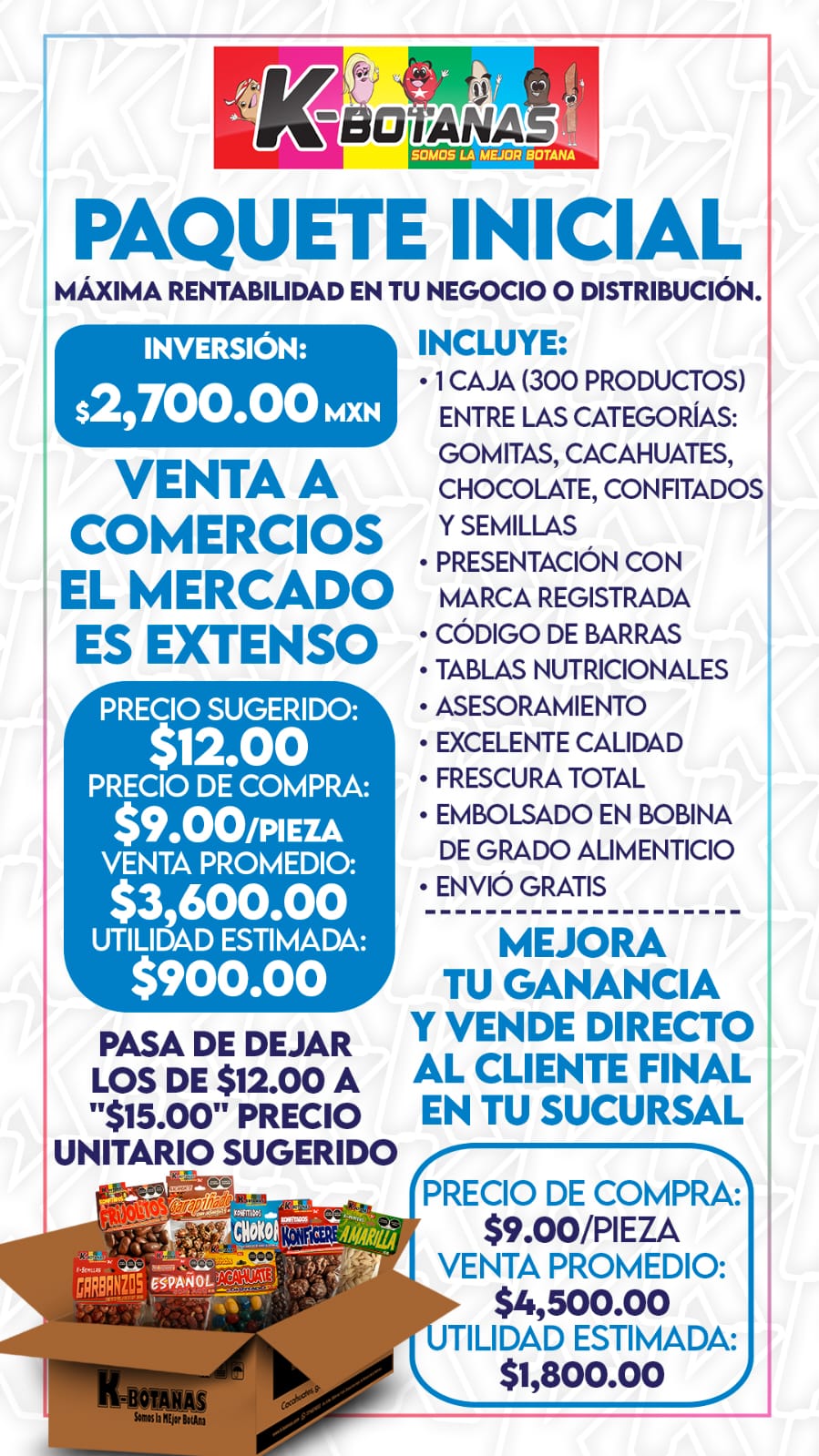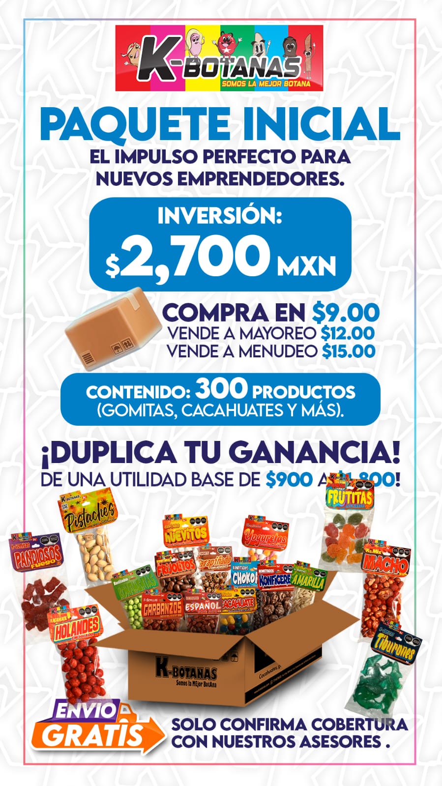 ¡Convierte tu antojo en tu próximo ingreso! Con el Paquete Emprendedor Inicial de K-Botanas, tienes todo lo necesario para arrancar un negocio rentable de snacks de alta calidad. Este kit está diseñado específicamente para quienes buscan independencia financiera con una inversión inteligente y productos que se venden solos.
